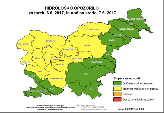 Danes in v noči na sredo lahko ob močnih krajevnih nalivih vodotoki porastejo v večjem delu države. Razlivanja voda so možna predvsem na zahodu in severozahodu države.