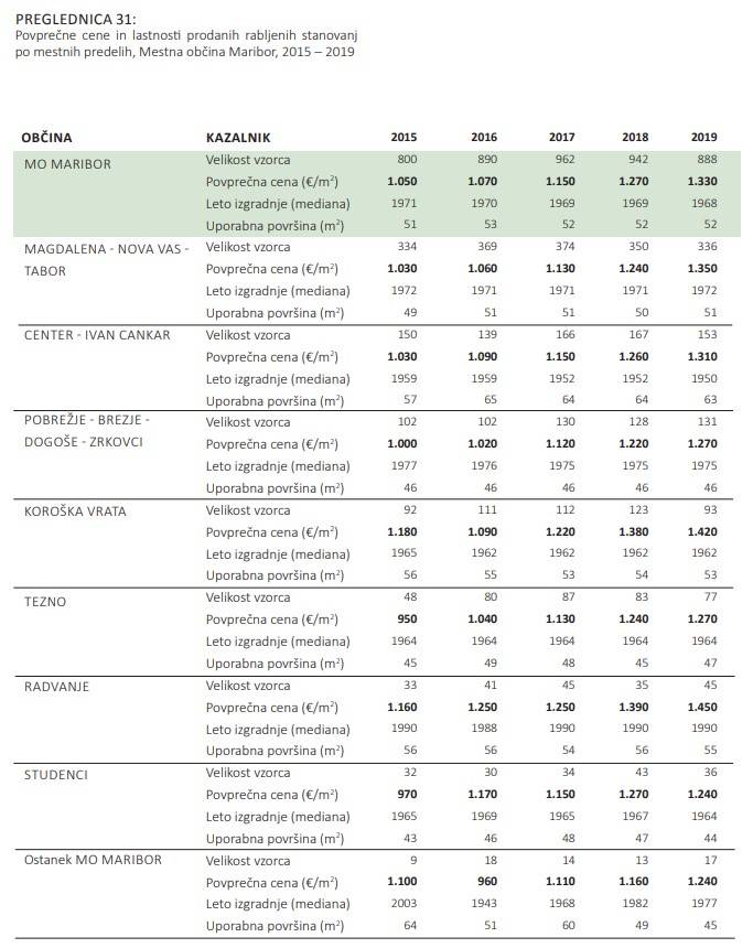 Po cenah stanovanj v mariborski občini sta tudi lani prednjačila mestna predela Radvanje in Koroška vrata, kjer je povprečna cena rabljenega stanovanja presegla 1400 evrov na kvadratni meter. Sledil je predel Magdalena - Nova vas - Tabor s povprečno ceno 1350 evrov na kvadratni meter.