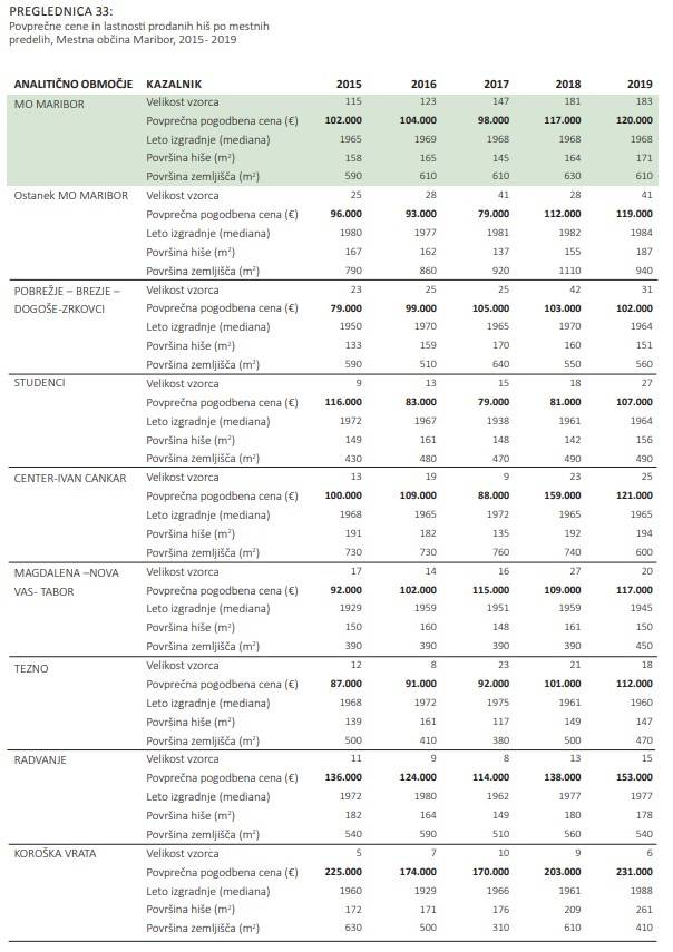 Ob upoštevanju velikosti in starosti prodanih hiš ocenjujemo, da so cene hiš s pripadajočim zemljiščem v mariborski občini v primerjavi z letom 2018 dejansko stagnirale, v primerjavi z letom 2015 pa so zrasle za okoli 15 odstotkov, kar je precej manj kot cene stanovanj v večstanovanjskih stavbah.