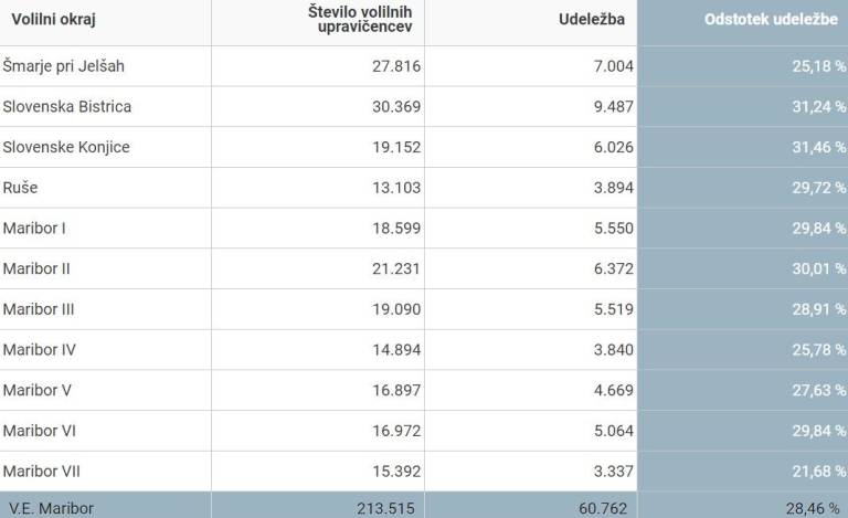 Najmanj volilnih upravičencev se je volitev v mariborski enoti udeležilo v okraju Maribor VII, kjer je glasovalo le 21,68 odstotkov volilnih upravičencev.