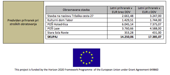 Osnovni namen investicijskega projekta je implementacija potrebnih ukrepov za celovito energetsko sanacijo (investicijski ukrepi) ter vzpostavitev učinkovitega energetskega upravljanja (organizacijski ukrepi) v javnih objektih, ki so v lasti Občine Logatec, z namenom funkcionalnega izboljšanja in povečanja energetske učinkovitosti, zmanjšanja stroškov energije in vzdrževanja oz. upravljanja objektov ter zmanjšanja emisij toplogrednih plinov in prašnih delcev.Po investiciji se pričakuje skupni letni prihranek energije v višini 213,5 MWh oziroma prihranek 18,37 ton CO₂ napram sedanjemu stanju.