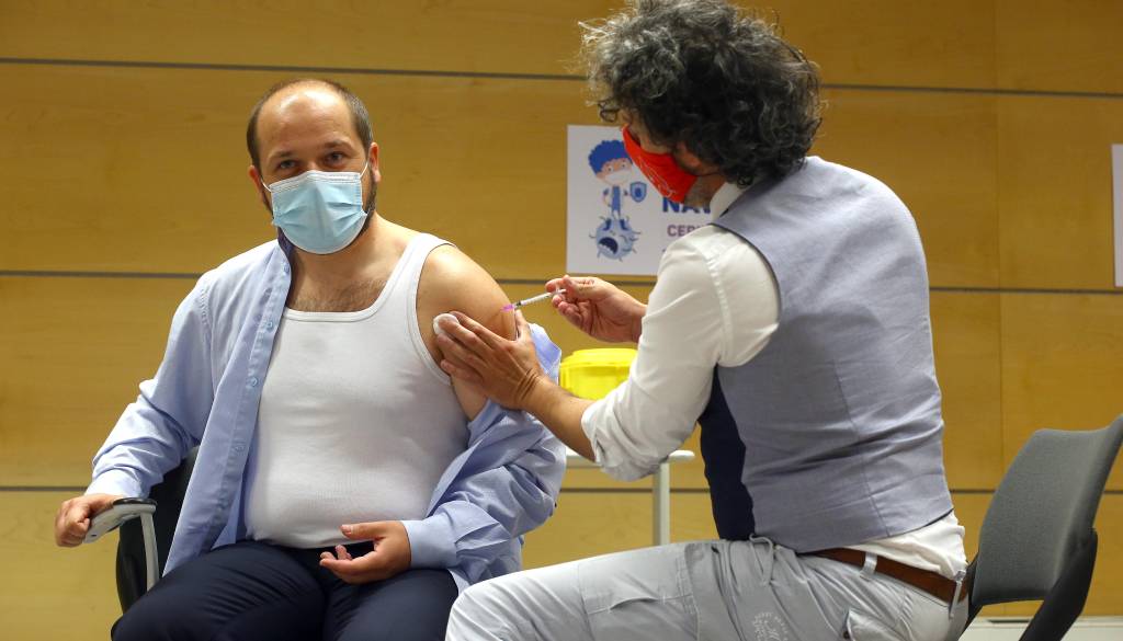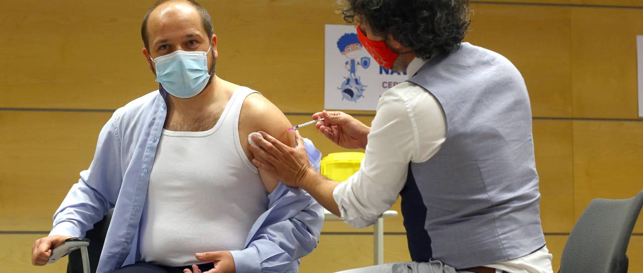 Minister za zdravje Janez Poklukar je danes zavihal rokav in dobil prvi odmerek cepiva AstraZeneca, z injekcijo pa je upravljal nihče drug kot prvi epidemiolog Mario Fafangel.