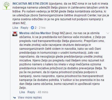 A z zadnjim varovalom se ne strinjajo pri Iniciativi mestni zbor. Kot sporočajo kar preko Facebooka, se štetja glasov nimajo namena udeležiti, zato prosijo za umik te trditve.