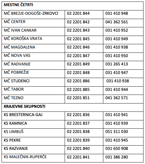 Telefonske številke mestnih četrti in krajevnih skupnosti, na katere se lahko obrnejo občani in se naročijo na termin za glasovanje: