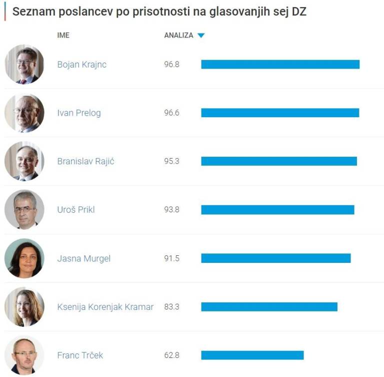 Prisotnost na glasovalnih sejah DZ: 95 % (povprečje: 81, največ: 99)