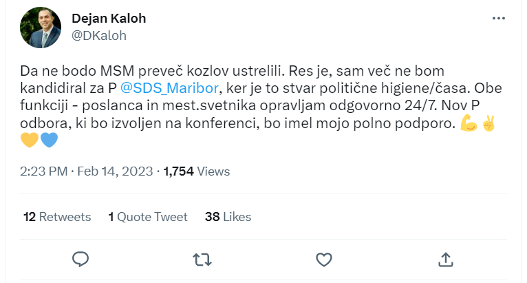 »Res je, sam več ne bom kandidiral za predsednika SDS Maribor, ker je to stvar politične higiene/časa. Nov predsednika odbora, ki bo izvoljen na konferenci, bo imel mojo polno podporo.«
