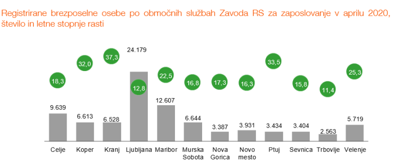 Na novo se je aprila na zavodu prijavilo 14.419 brezposelnih oseb, to je 83,7 odstotka več kot marca in kar 190,6 odstotka več kot aprila 2019. Od tega je bilo 6.209 brezposelnih zaradi izteka zaposlitve za določen čas, 481 iskalcev prve zaposlitve, 164 brezposelnih zaradi stečajev in 5.616 trajno presežnih delavcev. Število presežnih delavcev se je v primerjavi z marcem povečalo za 130,1 odstotka, glede na lanski aprila pa kar za 748,3 odstotka.