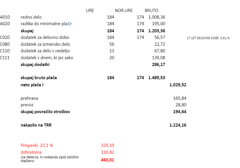 Dodatka za tako delovno dobo je nekaj čez 56 evrov, dodatka za izmensko delo nekaj čez 22 evrov, dodatka za delo v nedeljo nekaj čez 67 evrov ter dodatek za dela prost dan je nekaj čez 139 evrov. Dodatki so že zajeti v neto plačo 1.029,53 evrov. K temu pridajo še prevozne stroške in malico.
