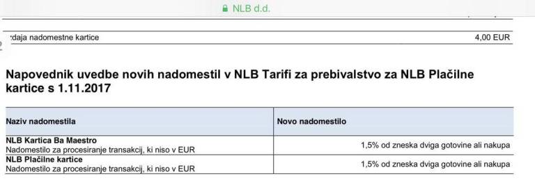 Največja državna banka NLB je s 1. novembrom uvedla takoimenovano Nadomestilo za procesiranje transakcij, ki niso v evrih. To pomeni, da bodo vse transakcije s plačilnimi karticami, ki ne potekajo v evrih, dodatno obremenili še s svojim nadomestilom. To bo znašalo kar 1,5 % od vrednosti zneska transakcije.