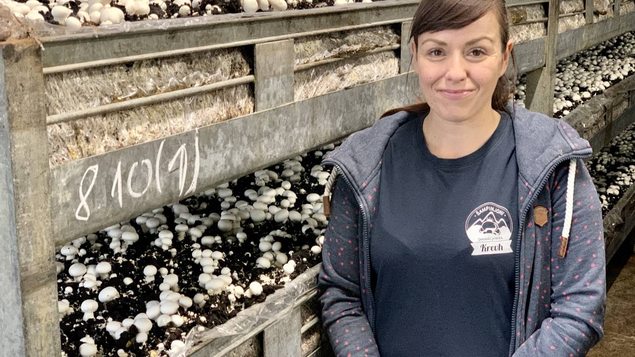 »To pomeni, da dobimo kompost z gobami in vsem skupaj že v teh policah in potem mi to z viličarjem vsak rastlinjak posebej naložimo. Imamo štiri etaže, tu so zdaj tri, tam je ena četrta in potem pobiramo po etažah,« pravi Špela Beranič iz Kmetije Krevh.