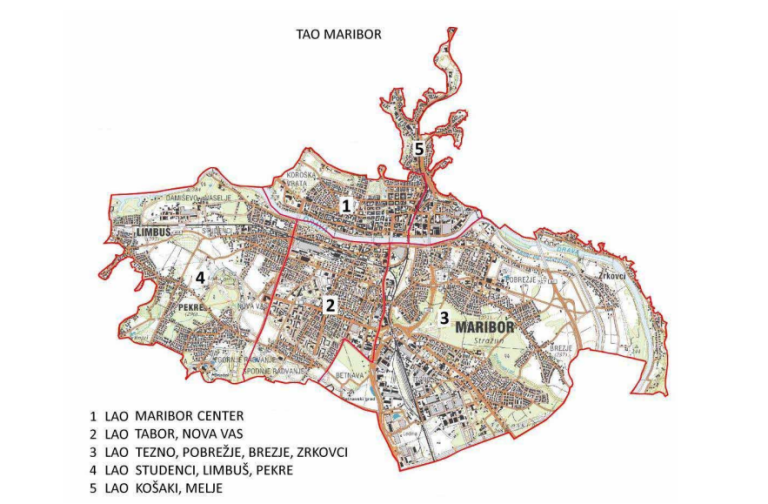 Geodetska uprava Republike Slovenije območje mesta deli na pet območij, in sicer lokalno analitično območje: