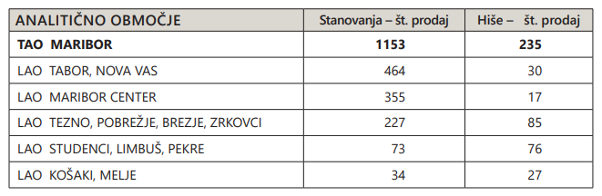 In kje so bile najnižje cene stanovanj? Najnižje so bile cene stanovanj na območju »Košaki, Melje«, kjer je bilo prodanih razmeroma malo, prodajala pa so se starejša ter večja stanovanja. Večina jih je bila prodanih po cenah od 1300 do 2100 evrov na kvadratni meter.