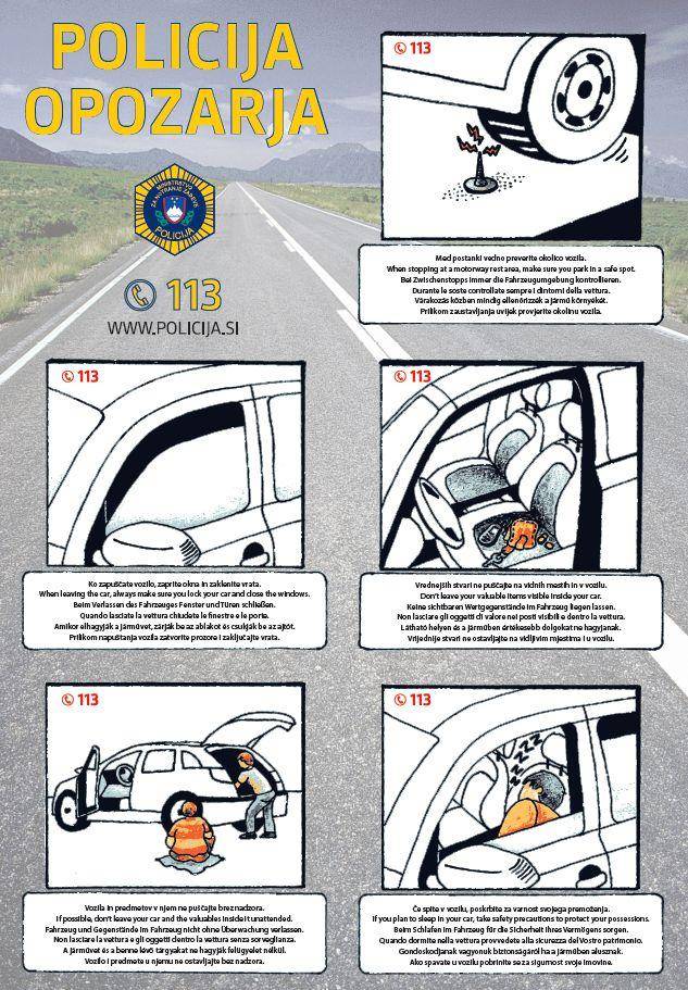 Slovenski policisti zato poudarjajo, da med postanki na avtocestnih počivališčih ves čas nadzirajte svoje vozilo in predmete v njem ter ga obvezno zaklenite, če se od njega oddaljujete. Prav tako vrednih premetov ne puščajte na vidnih mestih. Če vas med vožnjo zaustavljajo neznane osebe, vam zaustavljanje odsvetujejo, že zaradi osnovne prometne varnosti. Ko na avtocesti ali počivališču opazite sumljive osebe, to nemudoma sporočite na telefonsko številko 113 ali anonimni telefon 080 12 00.
