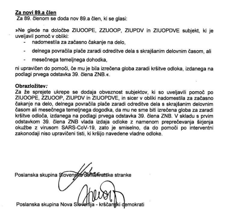 Kot je razvidno iz vloženih amandmajev k PKP7, sta ravno to sedaj predlagali poslanski skupini SDS in NSi. V predlogu novega 89. a člena bi tako dodali »da subjekt, ki je uveljavil pomoč v obliki nadomestila za začasno delo, delnega povračila plače zaradi odreditve dela s skrajšanim delovnim časom, ali temeljnega mesečnega dohodka, ni upravičen do pomoči, če mu je bila izrečena globa zaradi kršitve odloka, izdanega na podlagi odstavka 39. člena ZNB.«
