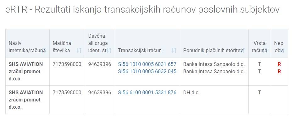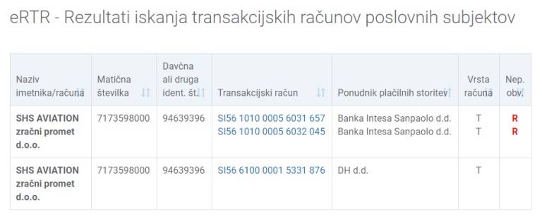 Kot je razvidno iz registra pri Ajpsu, imata dva računa družbe SHS Aviation d.o.o. pri banki Intesa SanPaolo, odprta 6. 6. 2017, vpisani rezervaciji. Medtem račun pri Delavski hranilnici, odprt 27. 10. 2016, nima vpisanih bremen.