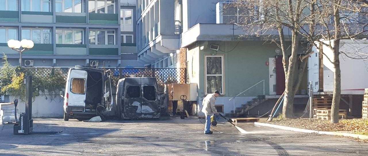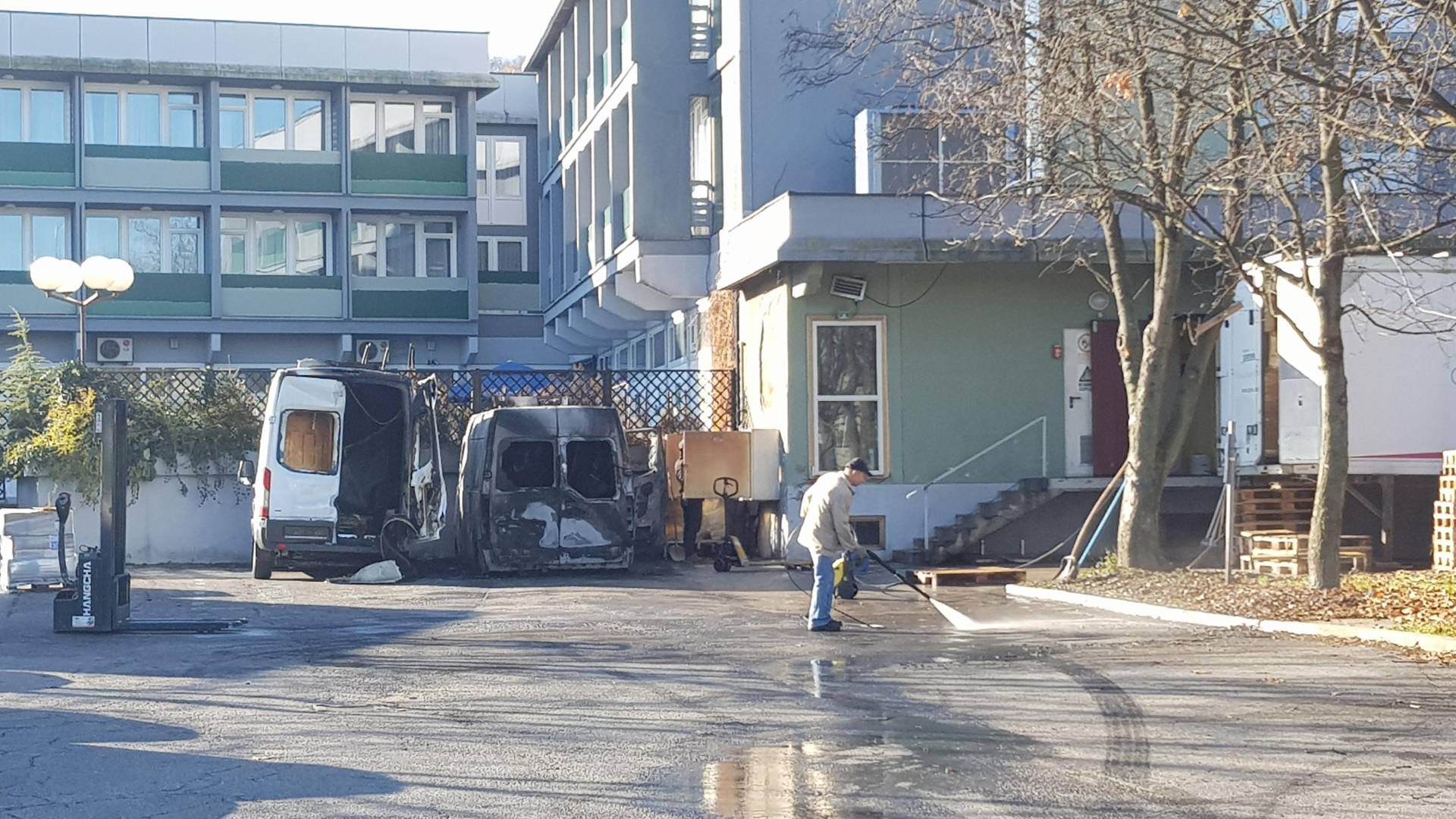 Na parkirišču za hotelom Stela še vedno počiva izkupiček sumljivega požara. Delavci odstranjujejo posledice težke noči. Za vozila rešitve ni bilo več, gasilci so lahko preprečili le širjenje požara na bližnji hotel.