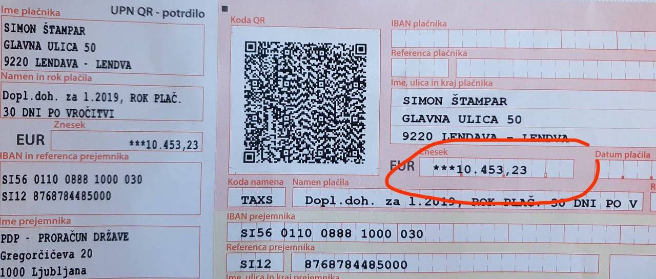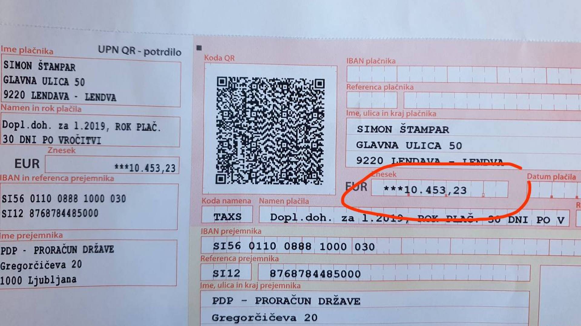Po pošti je namreč od Finančne uprave Republike Slovenije prejel pismo, da mora doplačati dohodnino za leto 2019, in to dobrih 10.450 evrov.