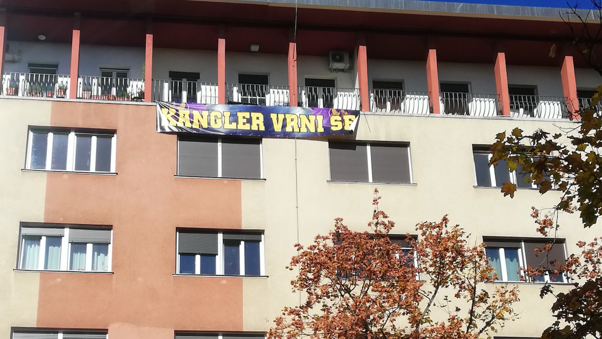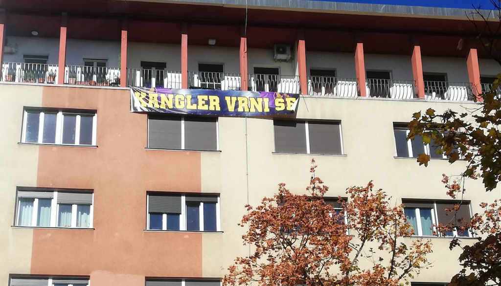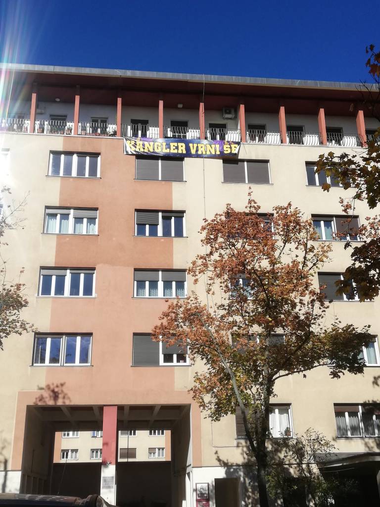 Iz najvišjega nadstropja stavbe v bližini Mestne občine Maribor visi napis: »Kangler, vrni se!«