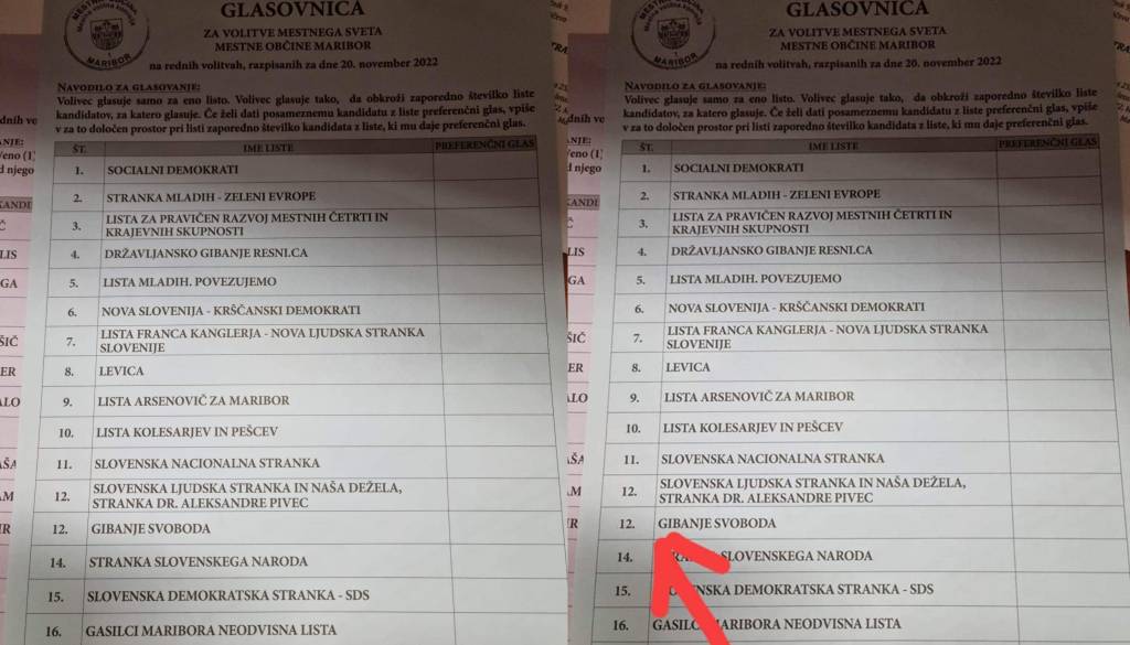 Danes pa so po začetku predčasnega glasovanja na lokalnih volitvah v Gibanju Svoboda Maribor opozorili na napako na glasovnici za volitve mestnega sveta. Na glasovnici pred Gibanjem Svoboda namreč ni izžrebane številke 13.