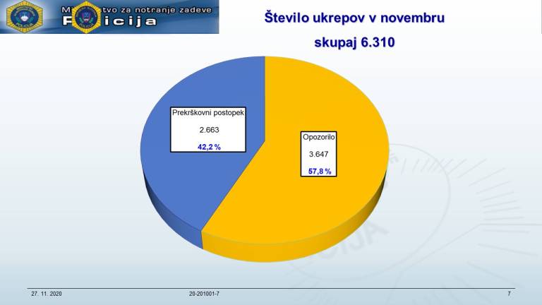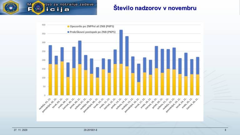 Od marca do 26. novembra je sicer policija prejela čez 4000 prijav kršitev s strani občanov, sami pa so ugotovili več kot 16 tisoč kršitev, izrekli skoraj 11 tisoč opozoril, uvedli 136 prekrškovnih postopkov in zdravstvenemu inšpektoratu predali skoraj osem tisoč predlogov za uvedbo postopka.
