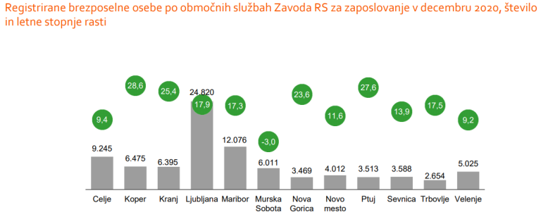 Kot kažejo podatki Zavoda Republike Slovenije za zaposlovanje, je bilo konec decembra registriranih 3,7 odstotka več brezposelnih kot novembra in 15,9 odstotka več kot decembra 2019.
