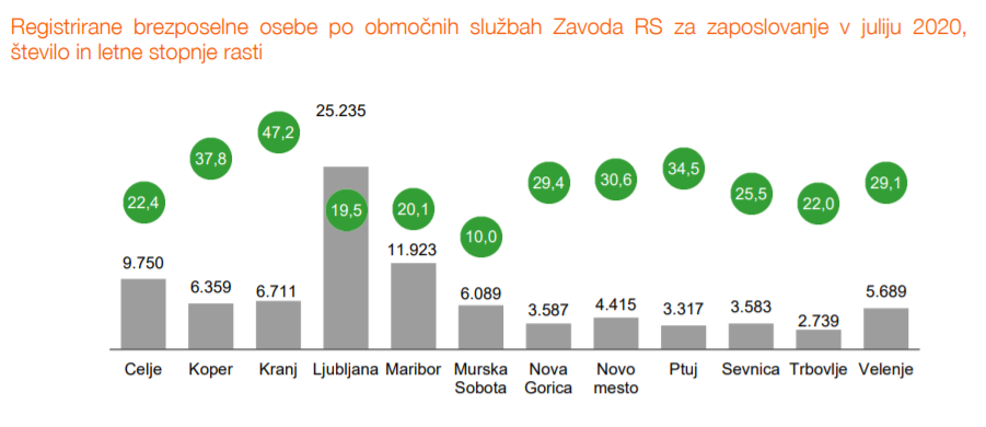 Julija 2020 se je brezposelnost v primerjavi s predhodnim mesecem povečala v območnih službah Zavoda: Novo mesto (+4,4 odstotka), Trbovlje (+3,6 odstotka), Ljubljana (+1,2 odstotka), Nova Gorica (+0,9 odstotka) in Sevnica (+0,5 odstotka). V ostalih OS se je glede na junij zmanjšala, najbolj v OS Koper (-2,7 odstotka), sledijo OS Ptuj (-1,7 odstotka), OS Maribor (-1,3 odstotka), OS Velenje (-1,1 odstotka), OS Murska Sobota (-1,0 odstotka), Kranj (-1,0 odstotka) in OS Celje (-0,2 odstotka).