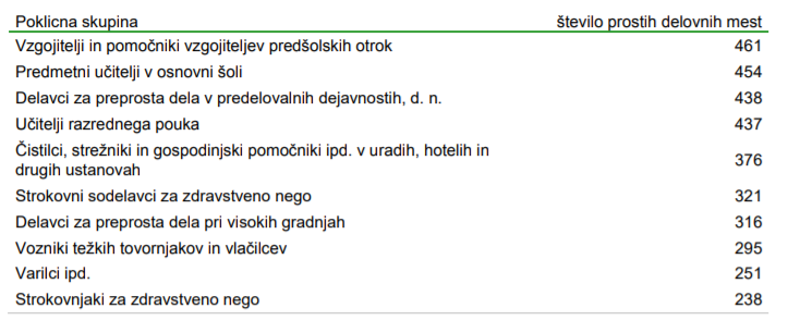 Delodajalci, med katerimi je bilo največ delodajalcev s področja izobraževanja, gradbeništva, predelovalnih dejavnosti ter zdravstva in socialnega varstva, so julija Zavodu sporočili 11.083 prostih delovnih mest, 5,4 odstotka več kot junija in 20,8 odstotka manj kot julija 2019, največ za naslednje poklicne skupine: