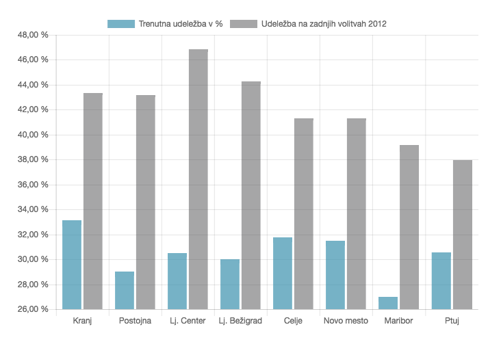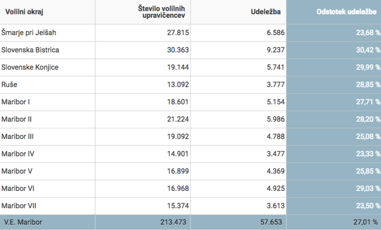 V volilni enoti Maribor je bila volilna udeležba do 16. ure najnižja v Sloveniji, in sicer 27,01-odstotna. Enota z najvišjo udeležbo je Kranj. Tam so zabeležili 33,13-odstotno udeležbo.