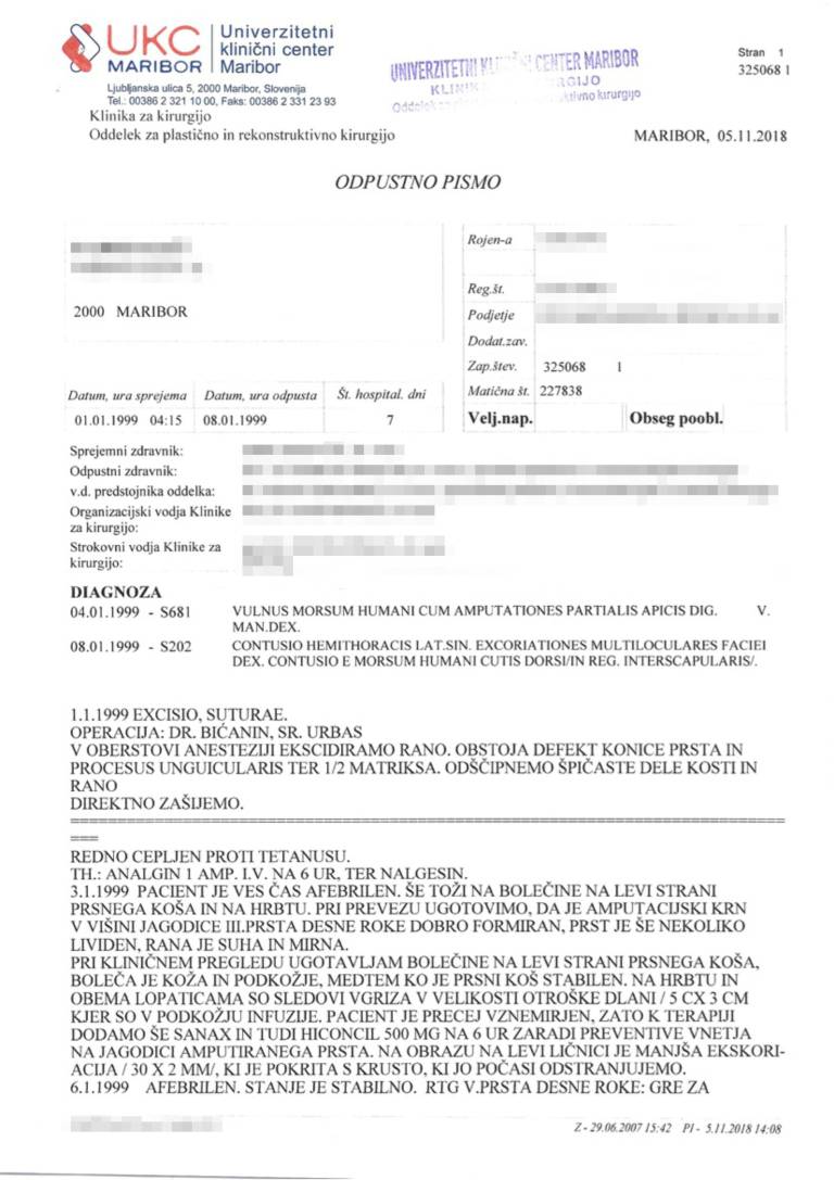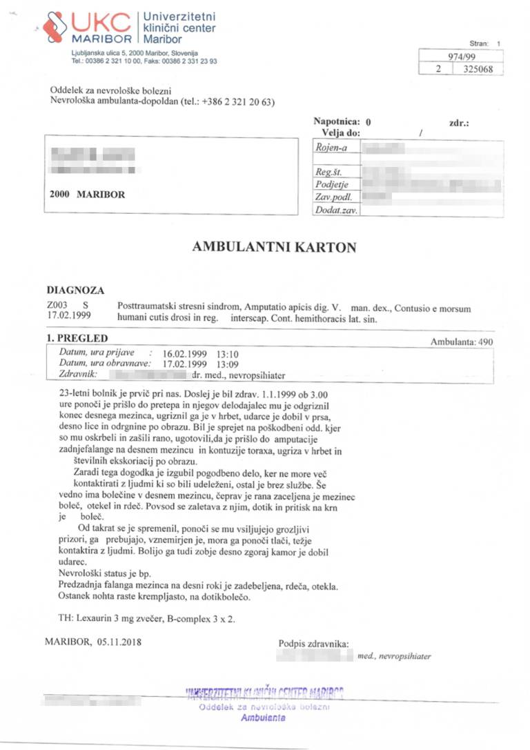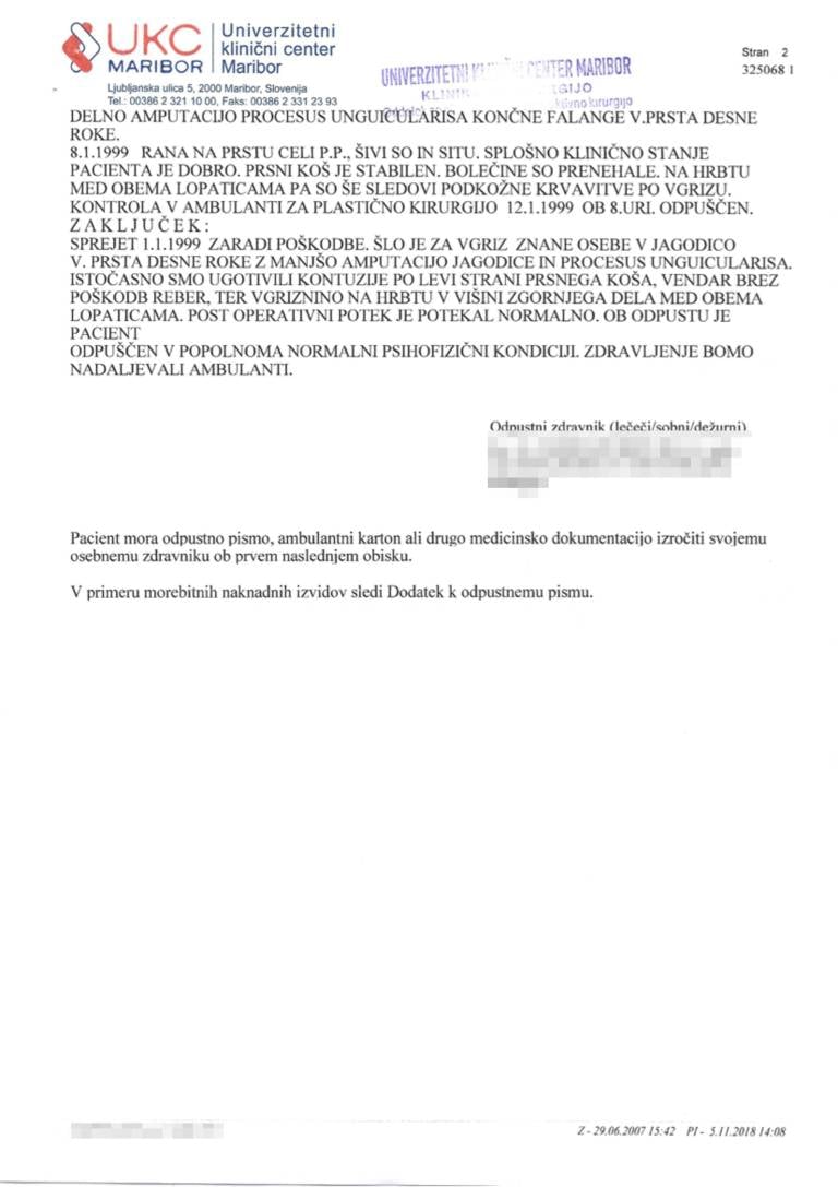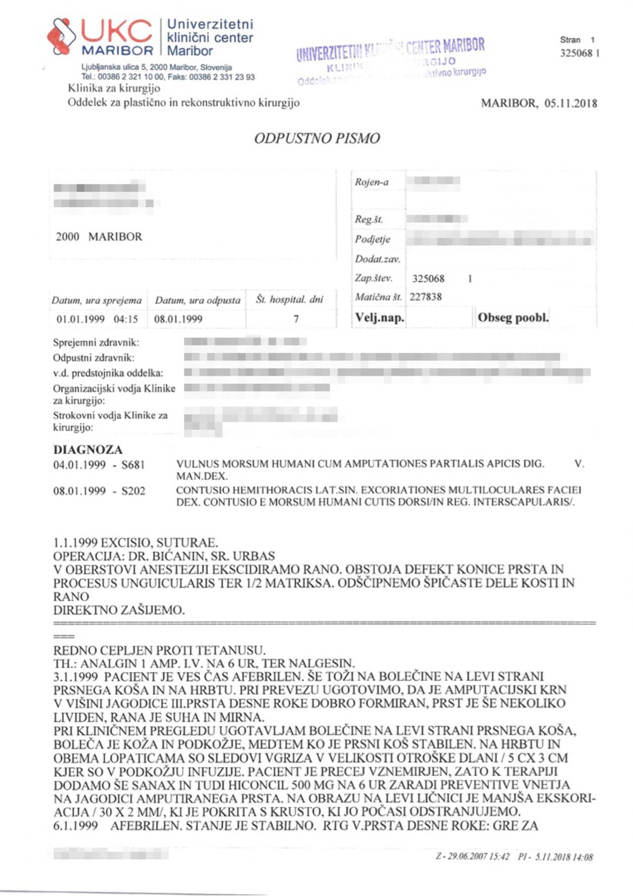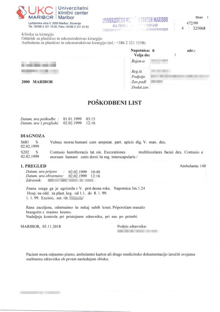 Bralec je v uredništvo Mariborinfo posredoval zdravstveno dokumentacijo oškodovanca, ki priča o ugotovljenih poškodbah. »Ob 3. uri ponoči je prišlo do pretepa in njegov delodajalec mu je odgriznil konec desnega mezinca, ugriznil ga je v hrbet, udarce je dobil v prsa, desno lice in odrgnine po obrazu,« je dogajanje zdravniku opisal oškodovanec.