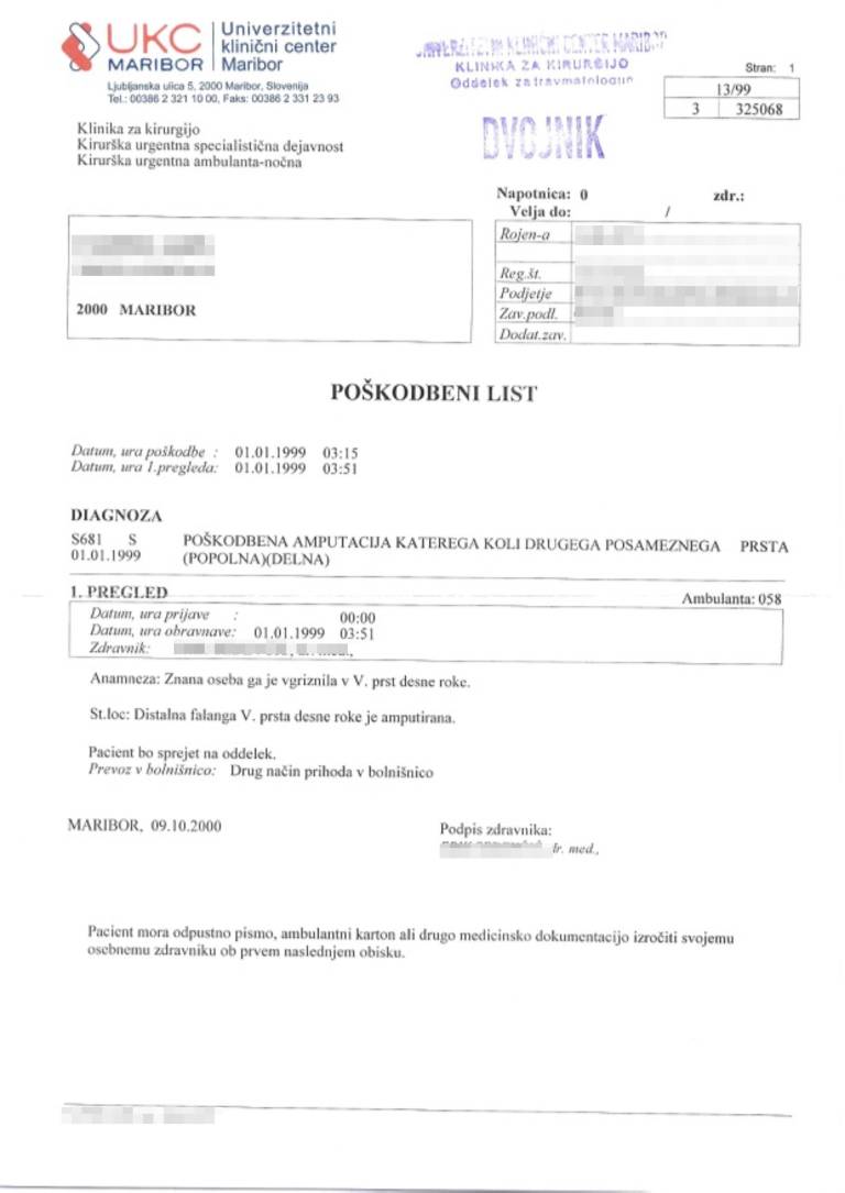 Zdravstvena dokumentacija: Delodajalec odgriznil konec desnega mezinca