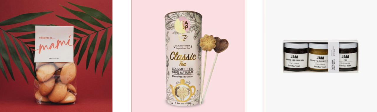 Odlična gurmanska darila so različne čokolade ali piškoti s personaliziranimi napisi, posebni čaji, seti marmelad, začimbe in kave.