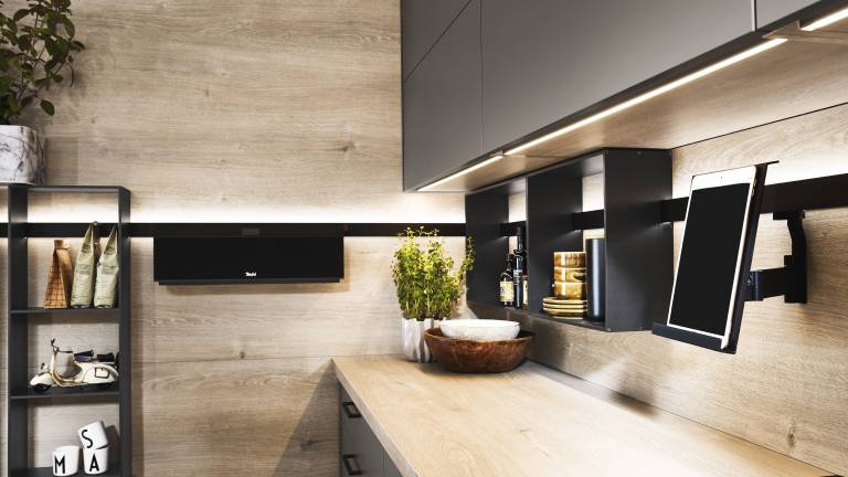 Tračnice in drogove lahko opremite tudi z LED razsvetljavo ter tako naredite svojo kuhinjo lepšo in modernejšo, ob enem pa poenostavite iskanje kuhinjskih pripomočkov. Več o tračnicah in drogovih lahko preberete tukaj.