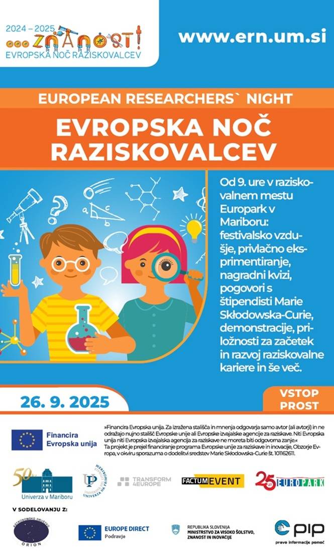 V petek, 26. septembra, med 9. in 21. uro se bo Europark spremenil v pravo raziskovalno mesto. Obiskovalci bodo lahko uživali v prazničnem vzdušju jubilejne 20. Evropske raziskovalne noči ter se preizkusili v privlačnih eksperimentih, nagradnih kvizih, zanimivih demonstracijah in interaktivnih delavnicah.