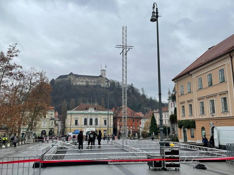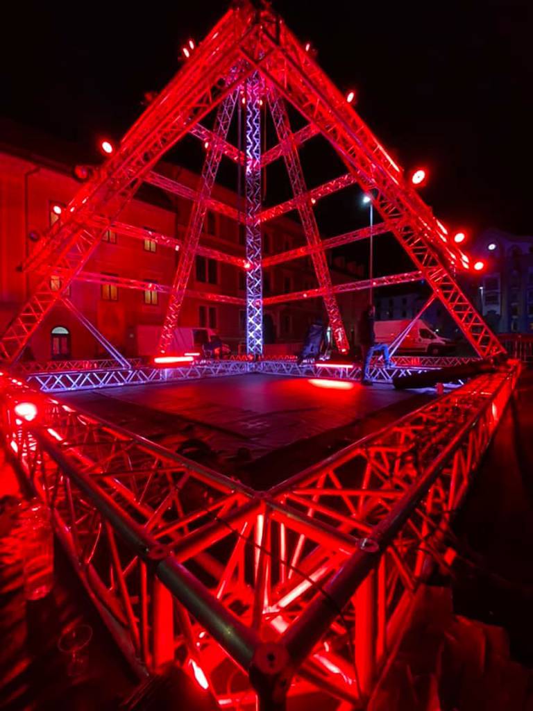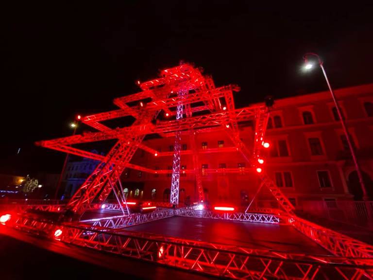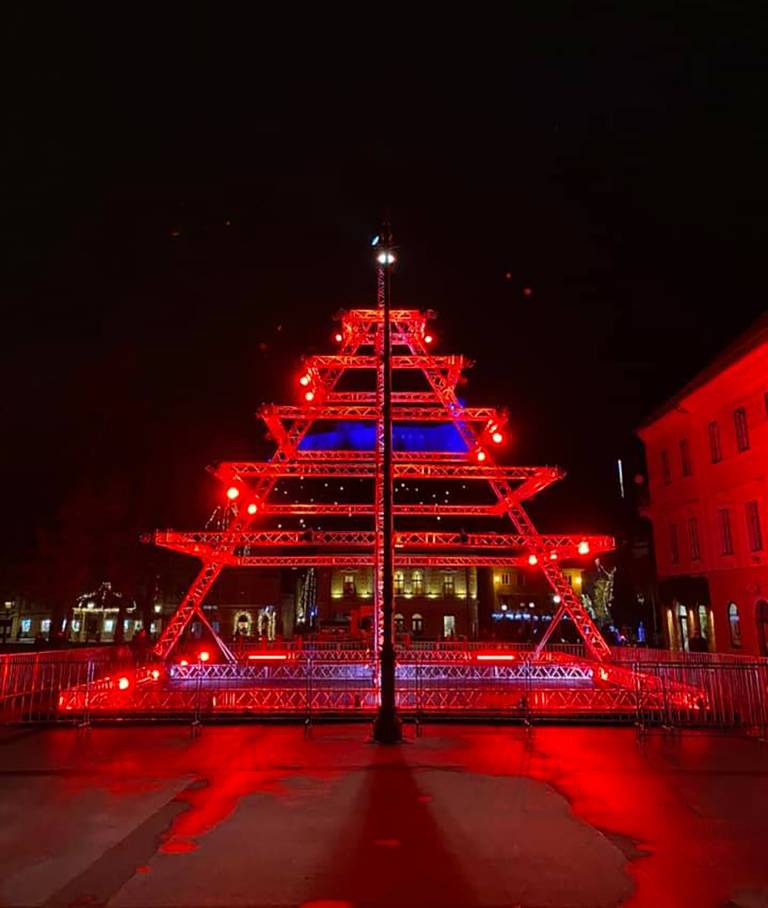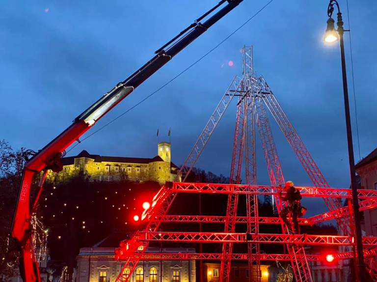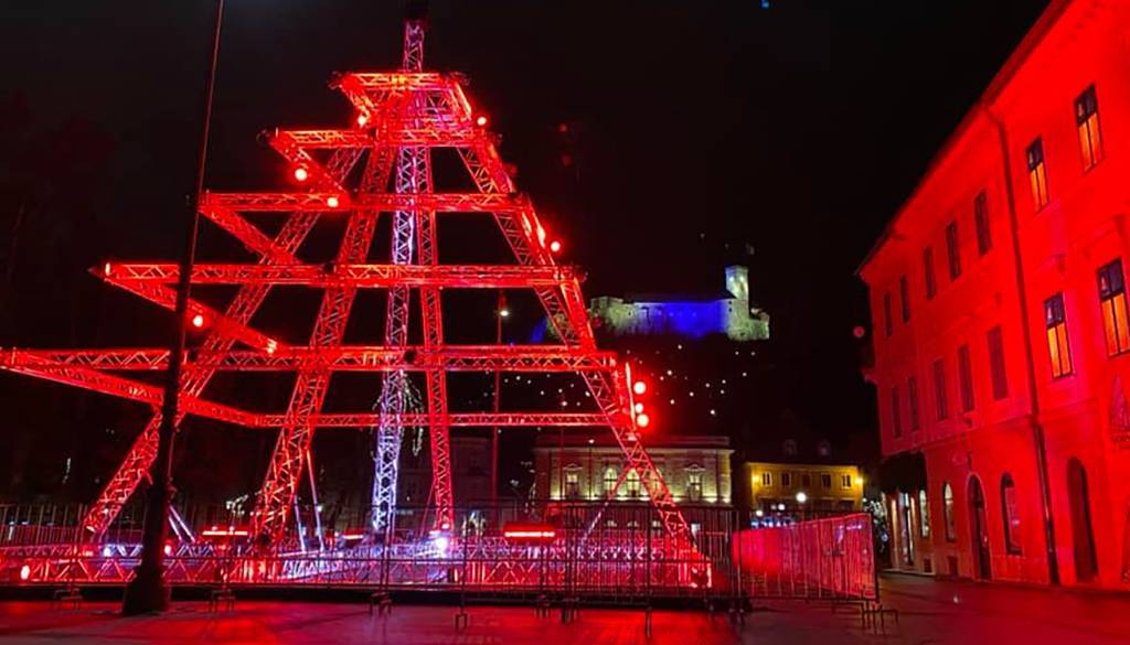 Na Kongresnem trgu so organizatorji koncertov združeni v društvu Mi delamo dogodke / We make events postavili jelko, sestavljeno iz odrskih konstrukcij in luči.