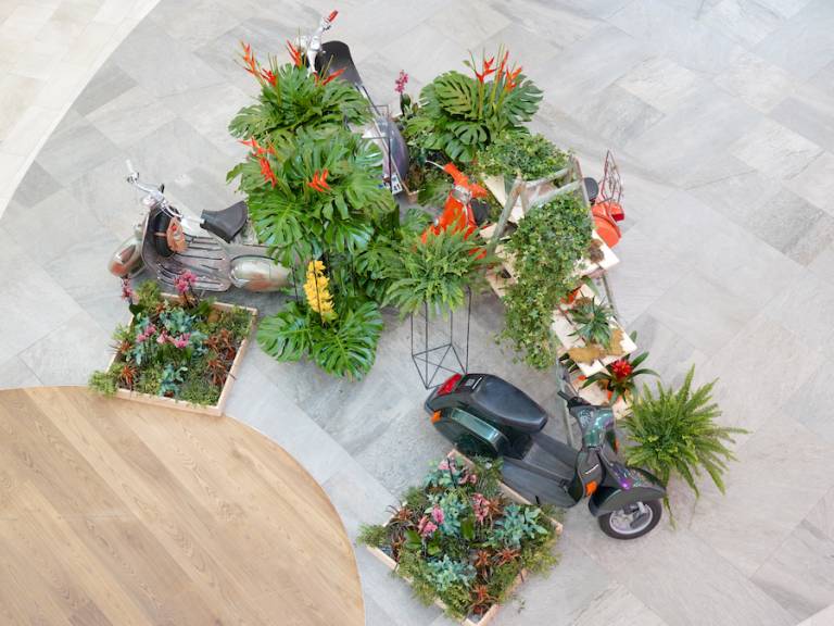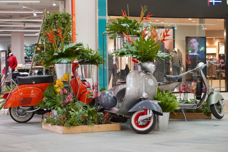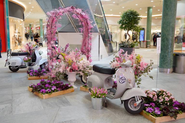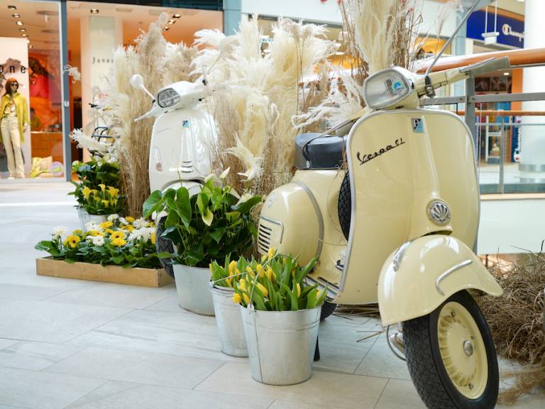 Legendarni skuterji, za katerimi se že več kot sedem desetletij obračajo pogledi, so v mariborskem nakupovalnem središču skupaj z živahnimi barvnimi cvetlicami brez dvoma poskrbeli za dobro voljo in navdih.