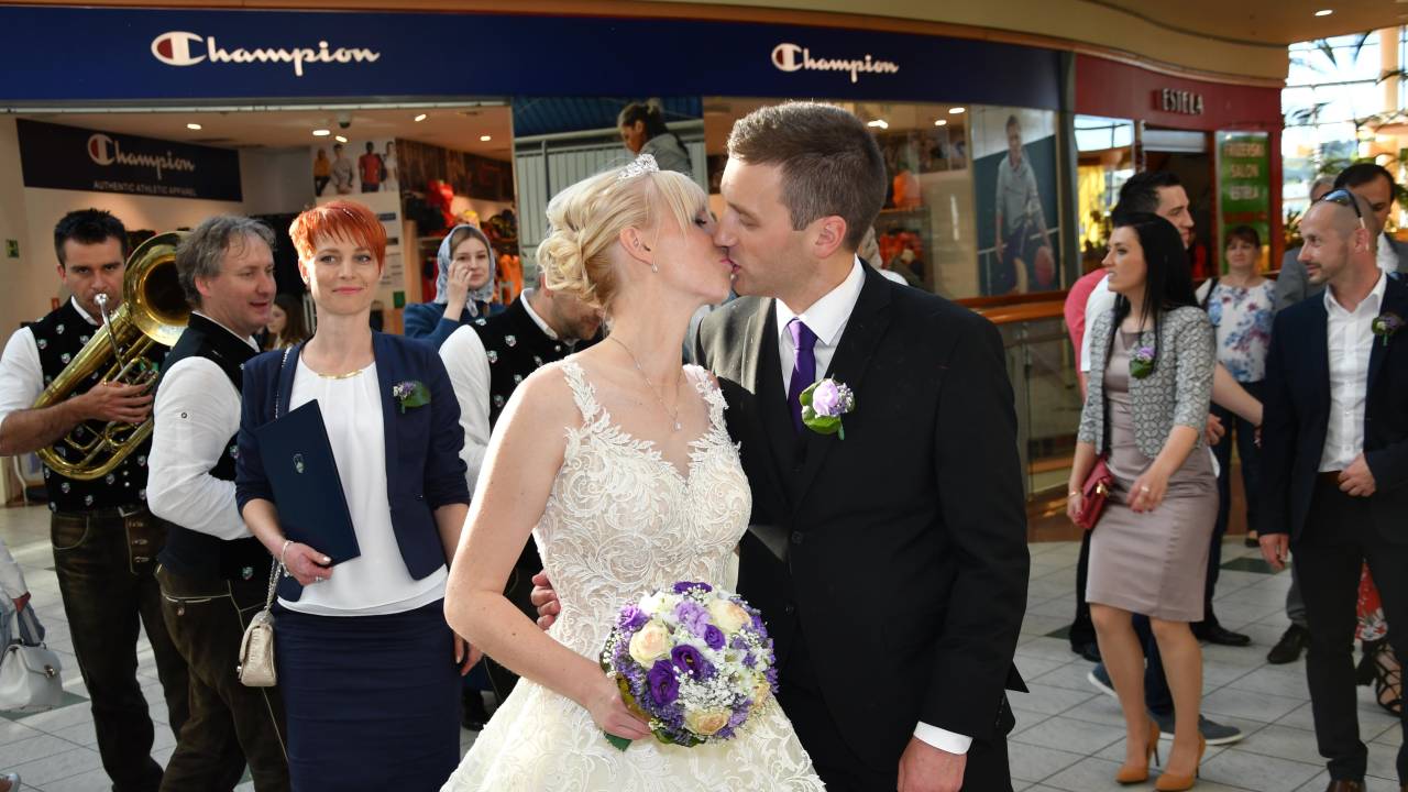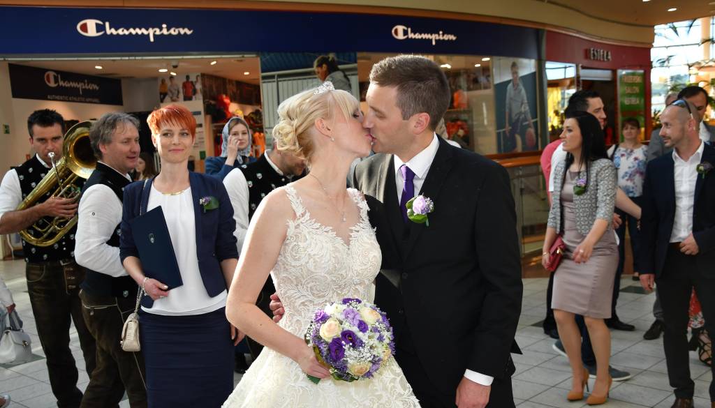 V nakupovalnem središču Europark v Mariboru si je ob 17. uri zaljubljeni par pred široko množico obljubil večno zvestobo.