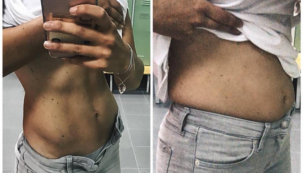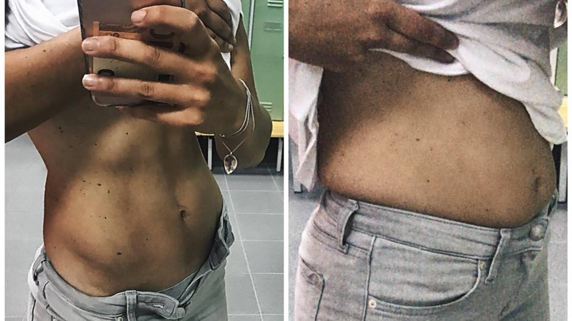 »Oboje sem jaz. Na obeh slikah se imam isto rada. Ker vem stvari, ker me noben medij, noben Instagram profil, nobena manekenka ne mora več nategniti. Napete mišice, vzravnana drža, spuščene hlače (prva slika) VS. kriva drža, kavbojke ki zarežejo v tkivo, sproščene mišice. 3 sekunde narazen,« je zapisala osebna trenerka in opozorila ženske naj imajo to v mislih, ko »vam naslovnica pokvari dan«.