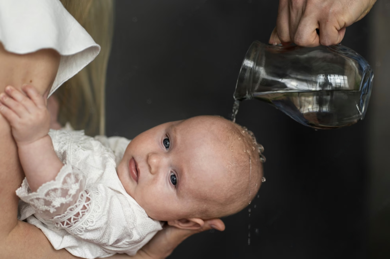 Po tem se otroka krsti z blagoslovljeno vodo, obred pa se zaključi s simboličnim maziljenjem z oljem in prižigom krstne sveče.