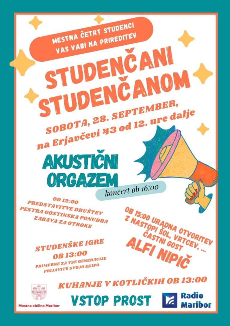 Ob 12. uri pa dogodek Studenčani Studenčanom na Erjavčevi ulici. Potekale bodo igre, tekmovanje v kuhanju ter pester program. Ob 16. uri tudi koncert skupine Akustični orgazem.
