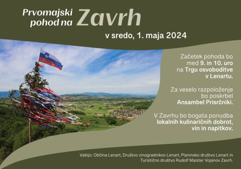 V sredo, 1. maja bo Prvomajski pohod iz Lenarta v Zavrh, ki se bo začel med 9. in 10. uro na Trgu osvoboditve v Lenartu. Za zabavo bo poskrbel ansambel Prisrčniki.