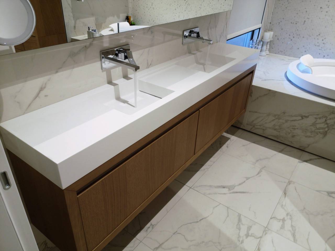 Ko govorimo o uporabi kerrocka, zagotovo ne moremo mimo njegove uporabnosti v kopalnicah. Izkazalo se je, da je zaradi preprostega čiščenja in odpornosti na vlago to popoln material za izdelavo umivalniških pultov, tuš kadi in banj.