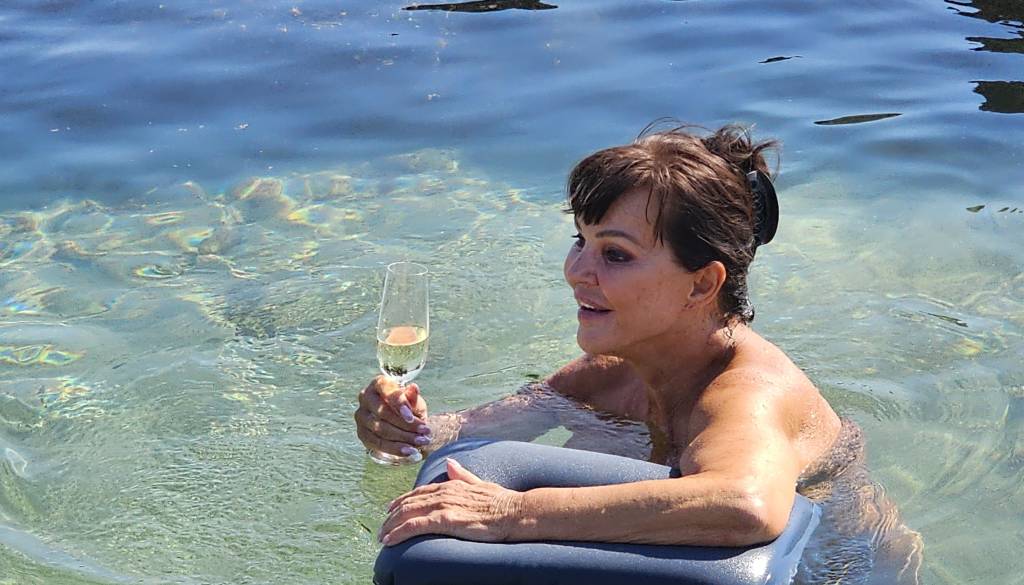 Ob fotografiji, na kateri se z nasmehom predaja soncu in vodi, je zapisala kratek, a pomenljiv zapis, ki razkriva njen pogled na trenutke miru in sprostitve.