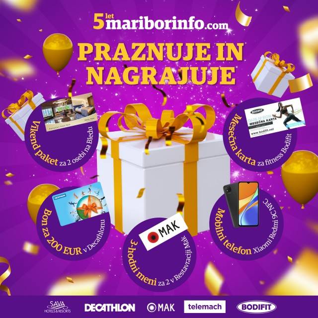 Ob mesečni karti za vstop v fitnes Bodifit, trihodnem kosilu v restavraciji Mak za dve osebi in darilnem bonu v Decathlonu v vrednosti 200 evrov in mobilnem telefonu Redmi 9C NFC zdaj podeljujemo še zadnjo veliko nagrado ob praznovanju pet let Mariborinfo.com.