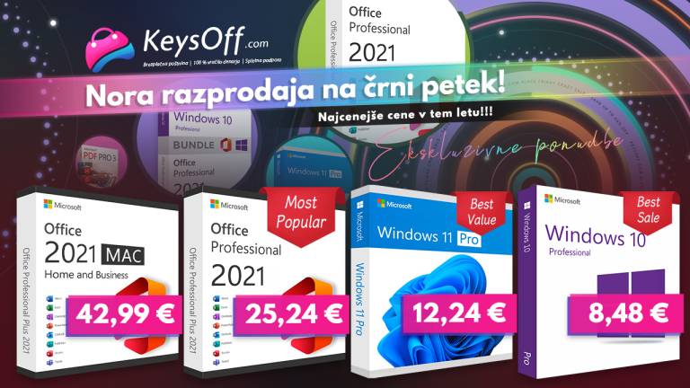 Pri Keysoffu so uradno začeli z razprodajo ob črnem petku, originalni MS Office 2021 Pro dobite za samo 25,24 evra. Windows 10 Pro le za 8,48 evrov in 2021 Home & Business Edition le za 42,99 evrov.