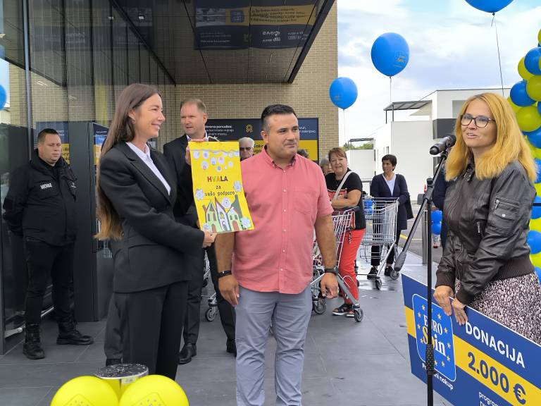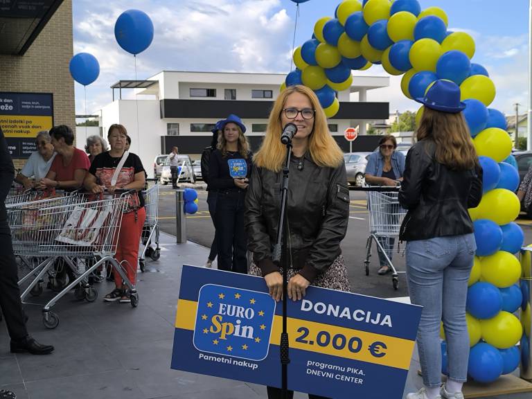 V uradnem delu odprtja nove trgovine je Natalija Pagon, direktorica marketinga v podjetju Eurospin Eko, v imenu podjetja predala ček v višini 2000 evrov programu PIKA. DNEVNI CENTER.
