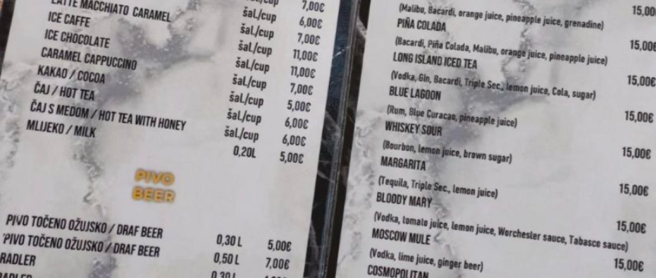 Na fotografiji, ki je zaokrožila po spletu, je viden cenik iz enga izmed barov v središču Poreča, kjer obiskovalci za običajne jedi in pijačo plačujejo več kot v elitnih evropskih prestolnicah.