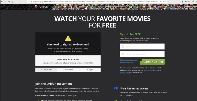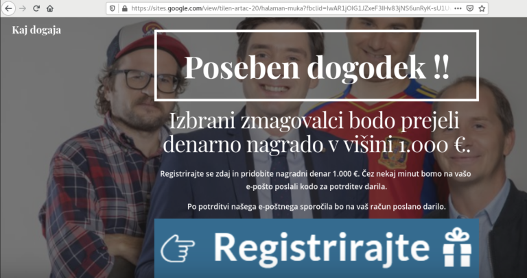 Klik na (zakrito) povezavo v objavi o nagradi odpelje na hitro ustvarjeno spletno stran na platformi “Google sites” (poceni in enostavno za goljufa), ki pa od nas zahteva “registracijo”. V naslednjem koraku nas klik preusmeri na stran za registracijo profila za neko trivialno storitev, ki obljublja spletno videoteko, zasledili pa so tudi že primer spletne knjigarne.