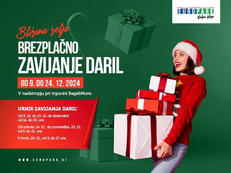 Od 9. do 24. decembra pa bo Europark poskrbel, da bodo vaša praznična darila zavita in pripravljena za obdarovanje. Pri trgovini Bags&More vas bodo vsak dan, do 20. ure, pričakali z brezplačnim zavijanjem daril, ki jih boste kupili v Europarkovih trgovinah ter gostinskih in storitvenih lokalih.