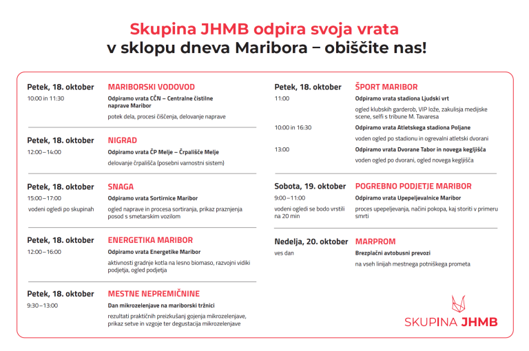 Dogajanju v sklopu mestnega praznika se bo pridružila večina podjetij, ki sestavljajo Skupino JHMB, med njimi Mariborski vodovod, Energetika Maribor, Snaga, Nigrad, Pogrebno podjetje Maribor, Šport Maribor, Mestne nepremičnine in Marprom.