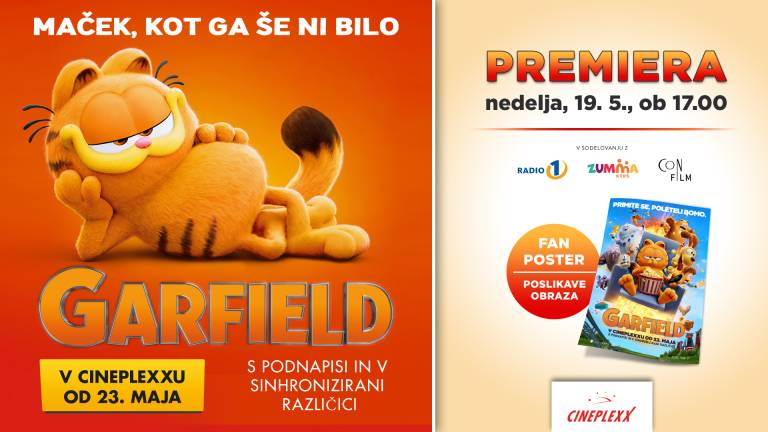 Premiera sinhronizirane avanture Garfield bo v nedeljo, 19. maja ob 17. uri v vseh kinih Cineplexx. Pred ogledom filma se bodo najmlajši razveselili otroškega kotička s pobarvankami, vsi otroci pa prejmejo tudi filmski plakat Garfield.